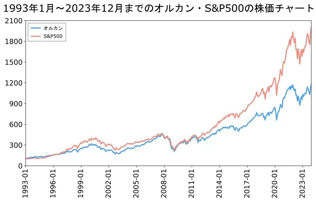 オルカン(青)が全世界の株3000社の動きに連動する株価の動きで、