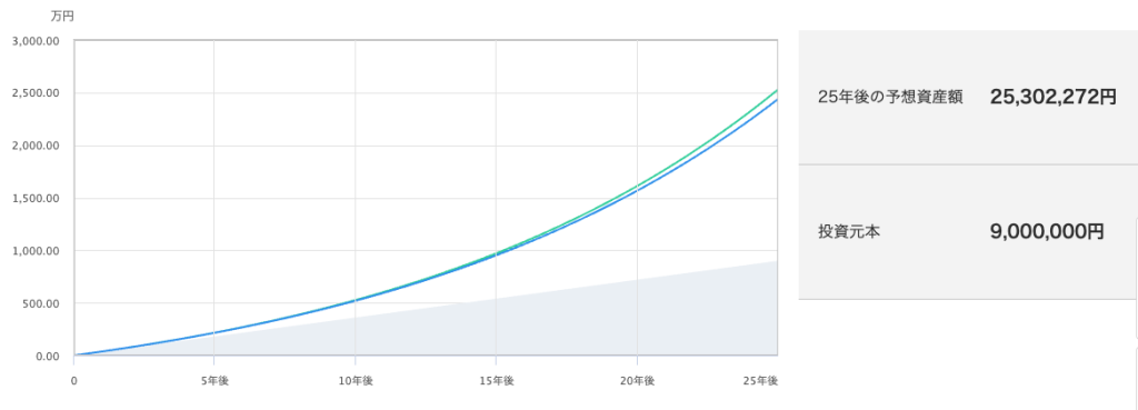 過去30年の全世界株の平均リターン7.5%で運用したときの結果だから、すごく妥当なシミュレーションだよ。