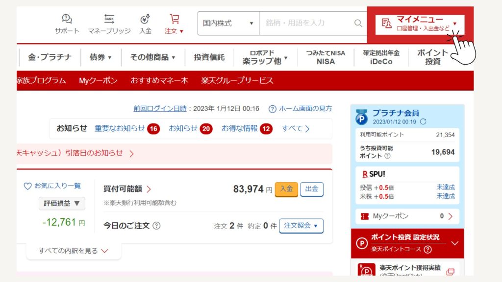 STEP1 PCサイトで右上の「マイメニュー」へ